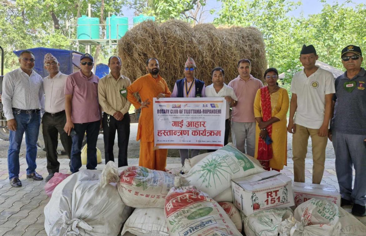 बुटवल । रोटरी क्लव अफ तिलोत्तमा रुपन्देहीले बुटवल उपमहानरपालिका वडा नं. ७ मा रहेको नन्दिनी गौशालामा गौ–आहार प्रदान गरेको छ । क्लवको वार्षिक कार्यक्रम अन्तरगत वातावरण दिवसको अवसर पारेर बुटवल उपमहानगरपालिका वडा नं. ७ शिवनगरमा रहेको नन्दिनी गौशालामा गौ–आहार प्रदान गरिएको हो ।