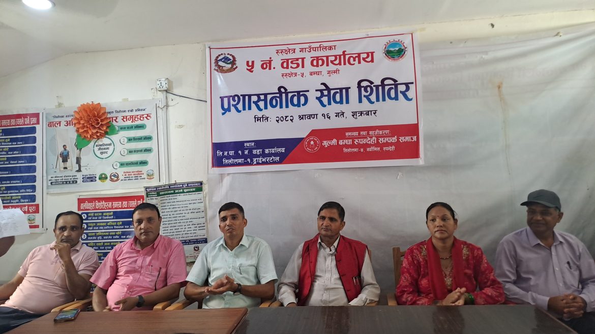 बुटवल । गुल्मीको रुरुक्षेत्र गाउँपालिका–५ बम्घाबाट रुपन्देही र आसपासमा बसोबास गर्दै आएका नागरिकलाई लक्षित गर्दै तिलोत्तमा–१, ड्राइभरटोलमा एक दिने प्रशासनिक सेवा शिविर सम्पन्न भएको छ।
