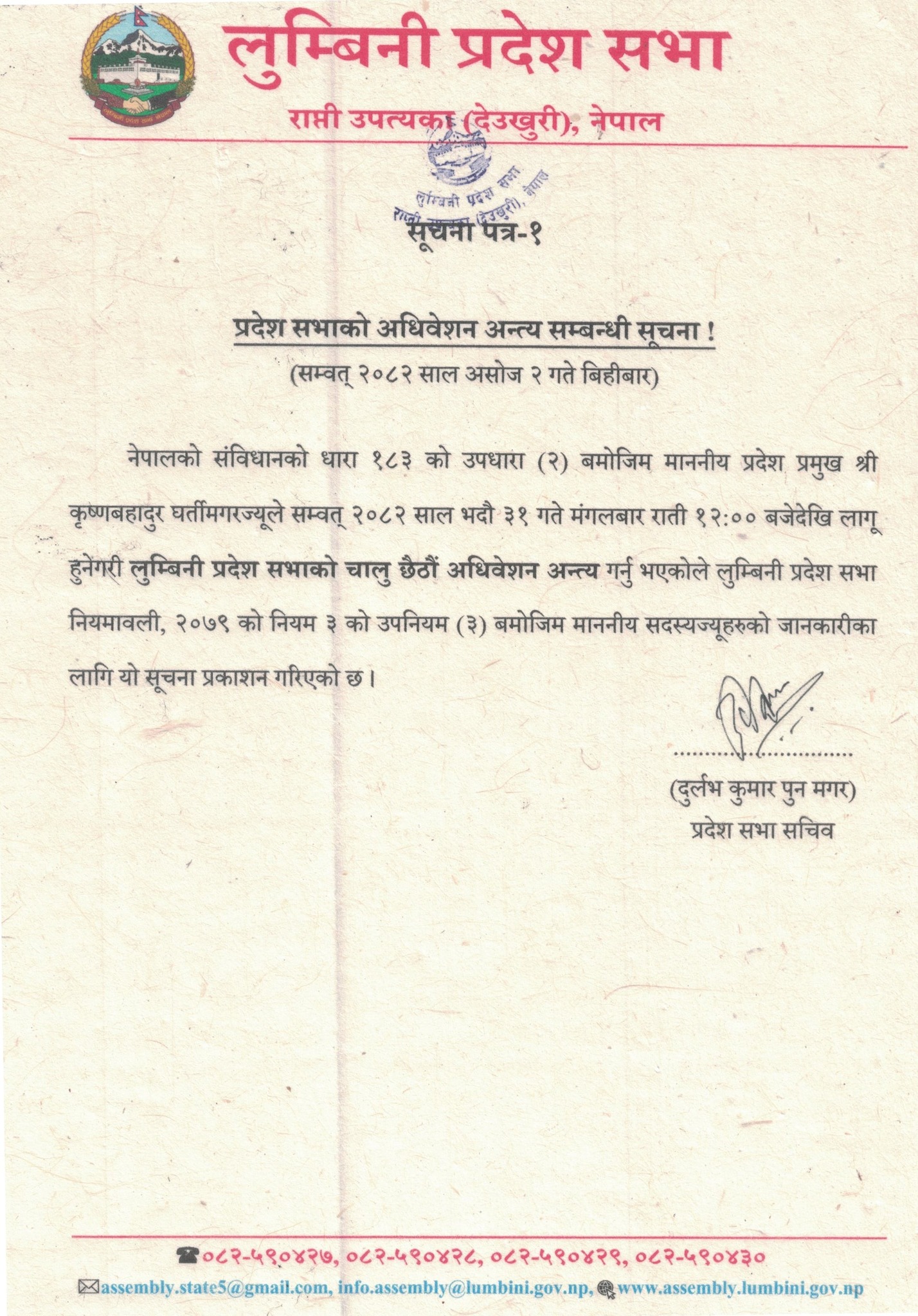 नेपालको संविधानको धारा १८३ को उपधारा २ बमोजिम प्रदेश प्रमुख घर्तिमगरले अधिवेशन अन्त्य गरेको र लुम्बिनी प्रदेशसभा नियमावली, २०७९ को नियम ३ उपनियम ३ बमोजिम प्रदेशसभा सदस्यलाई अधिवेशन अन्त्य भएको जानकारीका लागि सूचना प्रकाशित गरिएको सूचनामा उल्लेख छ।