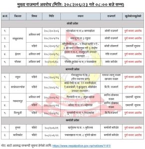 नेपाल प्रहरीले आज प्रकाशित गरेको बुलेटिन अनुसार नौ स्थानमा सडक पूर्णरुपमा अवरुद्ध भएको छ भने विभिन्न सडकका तीन स्थानमा एकतर्फी गाडी गुडिरहेका छन् ।