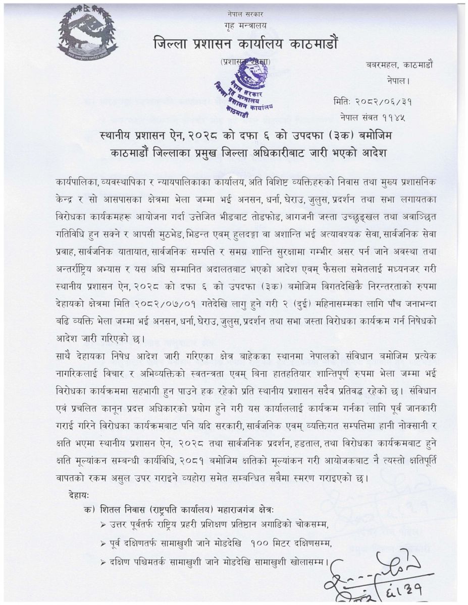 स्थानीय प्रशासन ऐन, २०२८ को दफा ६ को उपदफा ३ ‘क’ बमोजिम राष्ट्रपति कार्यालय शीतल निवासलगायतका क्षेत्रहरुमा आजदेखि लागु हुने गरी दुई महिनासम्मका लागि पाँच जनाभन्दा बढी व्यक्ति भेला भई अनसन, धर्ना, घेराउ, जुलुस, प्रदर्शन तथा सभाजस्ता विरोधका कार्यक्रम गर्न निषेध गरिएको छ।