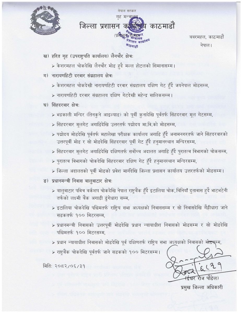 जिल्ला अदालतको पूर्वी मोडको प्रवेश मार्गदेखि जिल्ला प्रशासन कार्यालय उत्तरतर्फको मोडसम्म र प्रधानमन्त्री निवास बालुवाटार क्षेत्रमा पनि निषेध गरिएको छ।