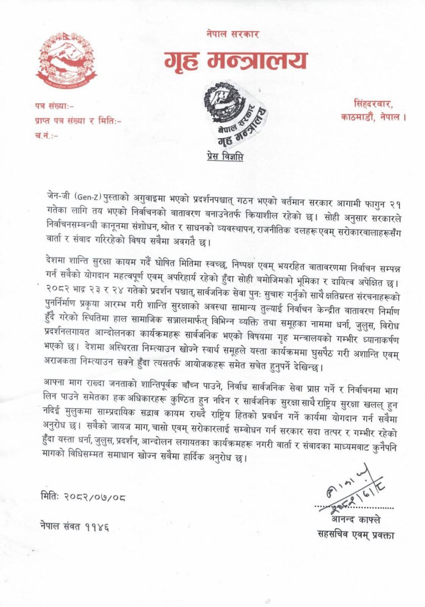 भदौ २३ र २४ गतेको आन्दोलनपश्चात् क्षतिग्रस्त संरचनाको पुनर्निर्माण भई शान्ति सुरक्षा सामान्य अवस्थामा फर्किएको र देश निर्वाचनमुखी वातावरणतर्फ उन्मुख रहेको मन्त्रालयले जनाएको छ।