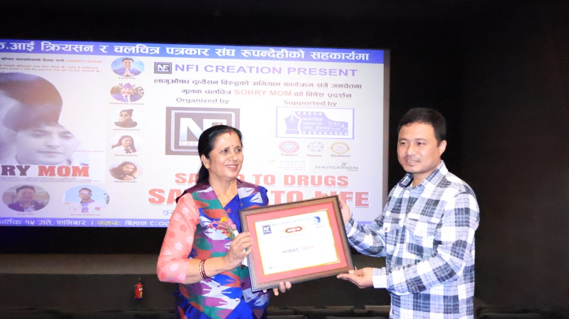 बुटवल। एनएफ आई क्रियसन र चलचित्र पत्रकार संघ नेपाल रुपन्देही शाखाको आयोजनामा शनिबार लागु औषध दुर्व्यसनी नियन्त्रण सम्बन्धि जनचेतनामुलक फिल्म सरी ममको बुटवल स्थित फ्रेन्ड्स सिनेमामा प्रदर्शन सम्पन्न भएको छ ।बिद्यालय कार्यक्रम अन्तर्गत रुपन्देहीका प्याब्सन, हिसान र सामुदायिक स्कुल तथा कलेजमा कार्यरत शिक्षक एबम प्रतिनिधिमुलक बालक्लबका विद्यार्थीहरु र संचारकर्मीमाझ ‘सरी मम’ नामक जनचेतनामुलक चलचित्र प्रदर्शन गरिएको हो । बुटवल उपमहानगरपालिका, प्याब्सन रुपन्देही , एनप्याब्सन, हिसान,नार्कोनन नेपाल, फ्रेन्ड्स सिनेमा को सहयोगमा प्रदर्शन गरिएको १ घण्टा ४५ मिनेटको सो चलचित्र ‘सरी मम’ प्रदर्शन गरिएको छ । बिनोद लामा कार्यकारी निर्माता रहेको फिल्म ‘सरी मम’ मा युवाहरु दुर्व्यसनीमा फस्न सक्ने कारण मध्ये साथी भाइको गलत सङगत र पारिवारको बेवास्ता र सपोर्टको विषयमा चलचित्र केन्द्रित छ ।