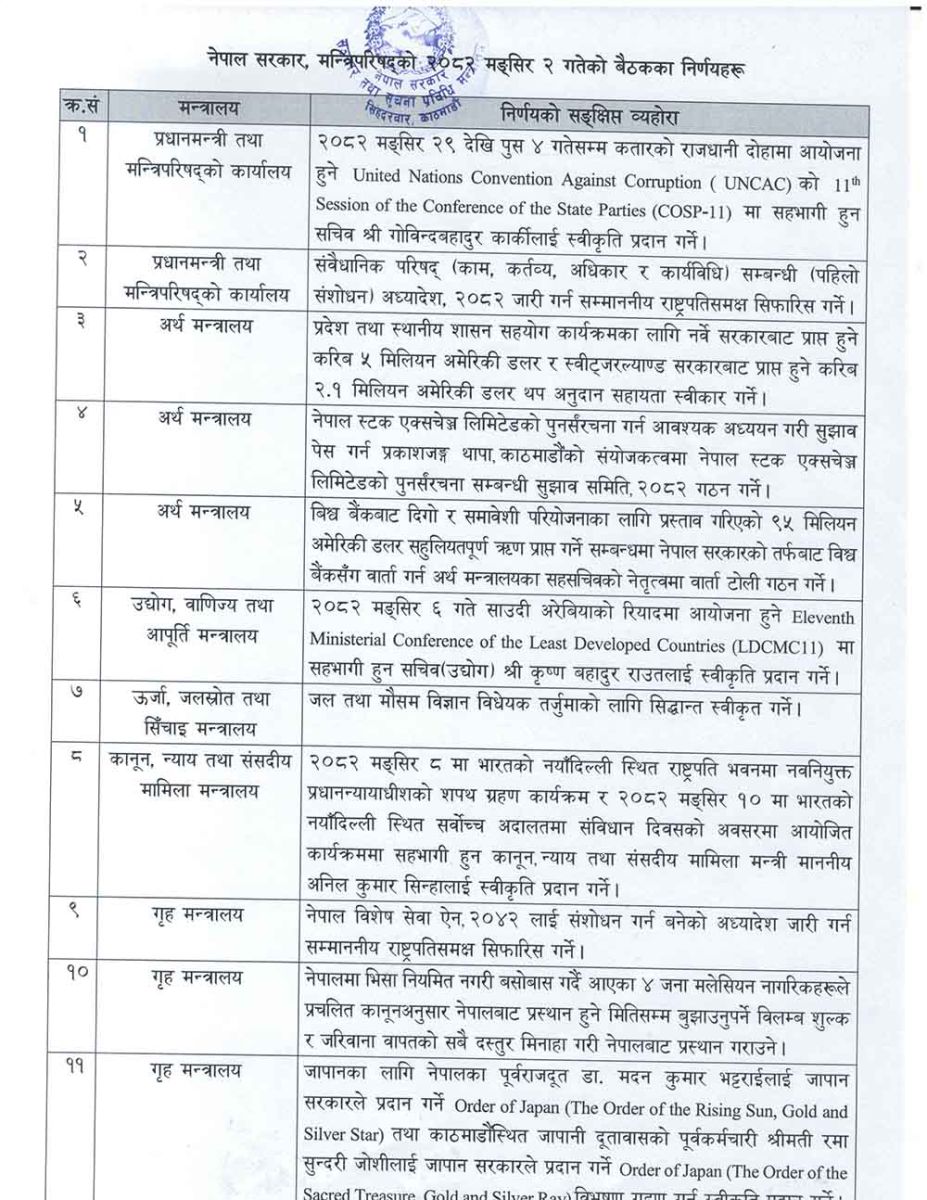 काठमाडौँ । मङ्सिर २ गते बसेको मन्त्रिपरिषद्को बैठकका निर्णयहरु सार्बजनिक गरिएको छ ।