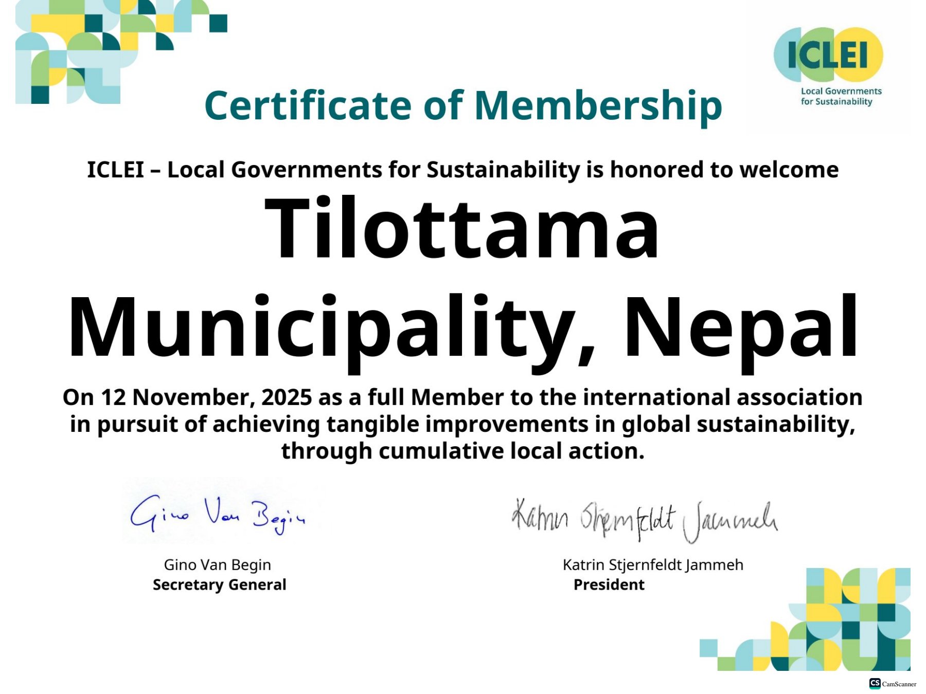 प्रमाणपत्रमा आई.सि.एल. ई. आई. का अध्यक्ष क्याट्रिन स्टजर्नफेल्ड्ट जम्मेह र सचिव भेन विगेनले हस्ताक्षर गरेका छन् । सदस्यतापछि तिलोत्तमा नगरपालिकाले शून्य–उत्सर्जन, प्रकृतिमा आधारित समाधान, जलवायु अनुकूलन, जलवायु जोखिम मूल्यांकन, वातावरणीय संरक्षण तथा दिगो विकाससम्बन्धी अन्तर्राष्ट्रिय कार्यक्रम, तालिम र परियोजनामा सहभागी हुने अवसर प्राप्त गर्ने नगर प्रमुख रामकृष्ण खाणले जानकारी दिनुभयो ।
