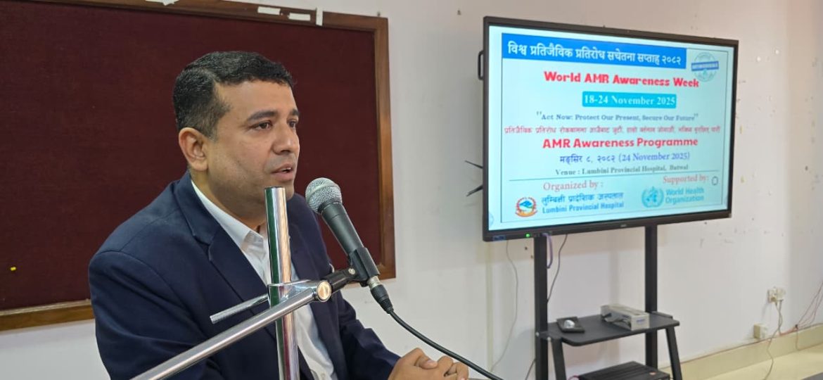 कार्यक्रममा बोल्दै लुम्बिनी प्रदेश स्वास्थ्य महाशाखा प्रमुख नोदनारायण चौधरीले प्रतिजैविक प्रतिरोध रोकथामका लागि हरेक नागरिक सचेत हुन आवश्यक रहेको बताए । चिकित्सकको सल्लाहविनानै औषधिको प्रयोग गर्ने तथा आवश्यक मात्रा तथा समयभन्दा फरक तरिकाले औषधिको प्रयोग गर्ने प्रवृत्तिलाई अन्त्य गर्नुपर्ने उनले बताए । औषधिको सही प्रयोग नगर्दा ठूलो स्वास्थ्य संकटको सामना गर्नुपर्ने चौधरीले बताए ।